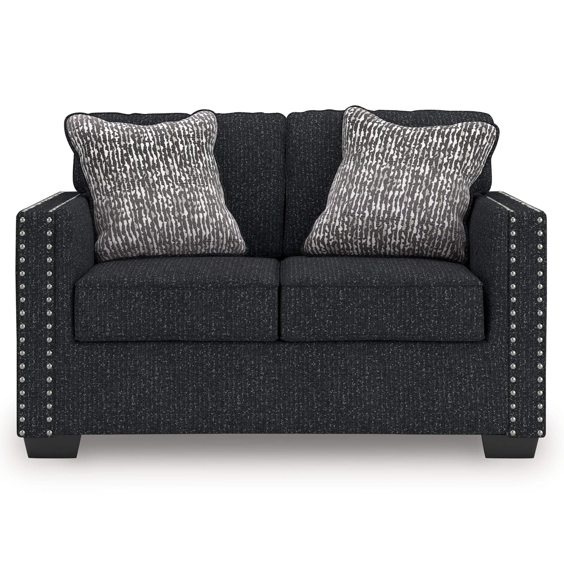 This stunning loveseat leaves a lasting impression. Its cozy cushions, chic coal-colored upholstery and striking nailhead trim are a perfect blend of comfort and contemporary design. And here’s the showstopper—ambient red, white and blue LED lighting along the loveseat's base. The look is simply wow.