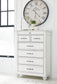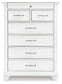 Give your retreat vintage charm with this chest. Sporting a beautifully distressed whitewash finish, it includes seven varied-sized drawers for an organized wardrobe. Generously scaled moulding from top to bottom, along with bun feet and drawer handles with a transitional aesthetic, give this chest character—evoking the feel of a quaint cottage escape.